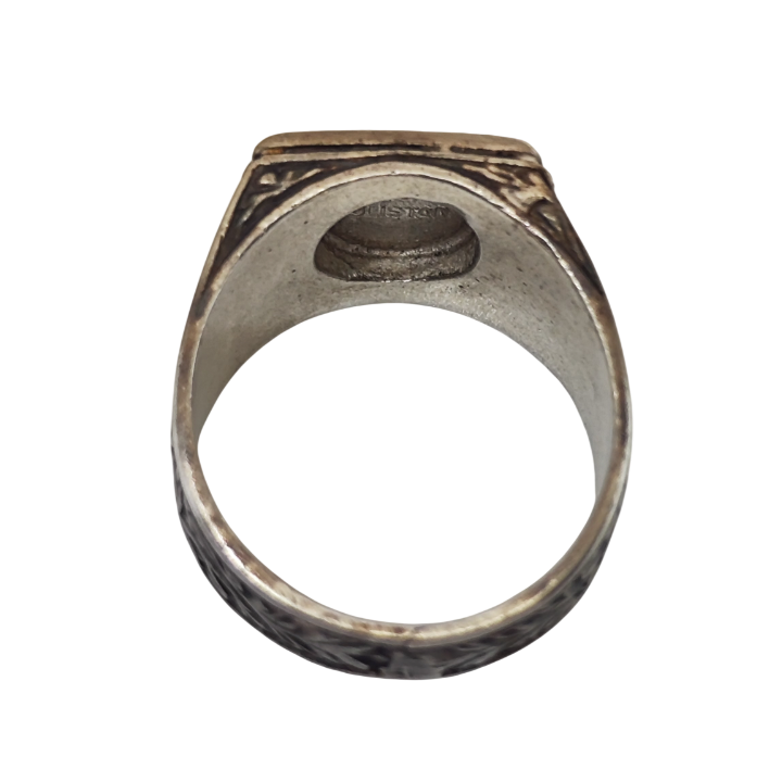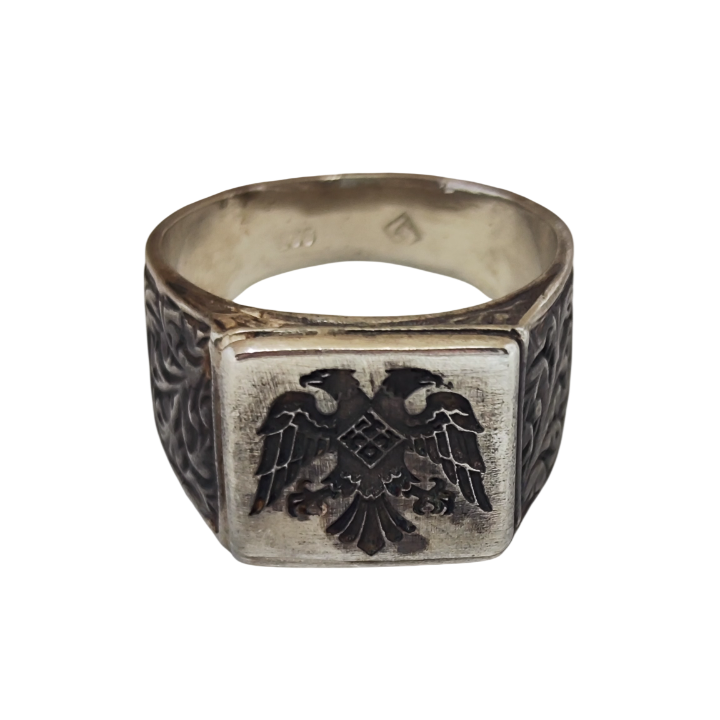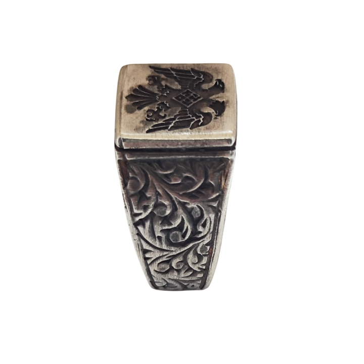 Anadolu Selçuklu Devleti’nin gücü ve hâkimiyet anlayışını simgeleyen çift başlı kartal motifi, bu yüzüğün merkezinde güçlü bir sembol olarak yer alır. Mat yüzey üzerine işlenen kartal figürü, tarihsel bir mirası modern bir yorumla bir araya getirir. Yan kısımlardaki detaylı kabartma motifler yüzüğe derinlik kazandırırken tasarımın vintage karakterini güçlendirir. Kapalıçarşı’nın köklü zanaatkârlık geleneği içinde el işçiliğiyle üretilmiş olan bu yüzük, Anadolu Selçuklu sanatının sembolik gücünü taşıyan zamansız ve karakterli bir parçadır