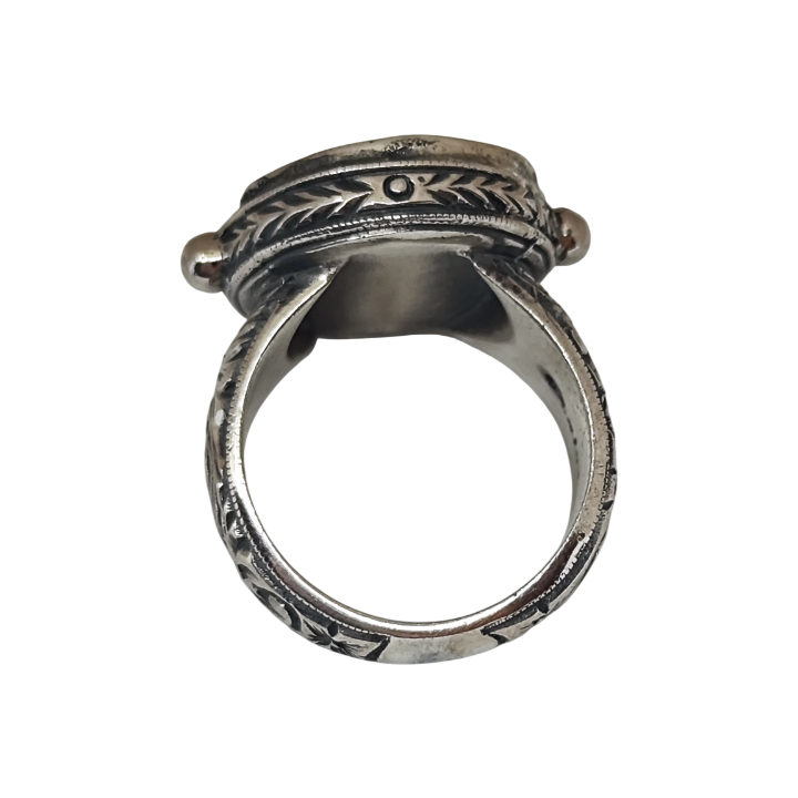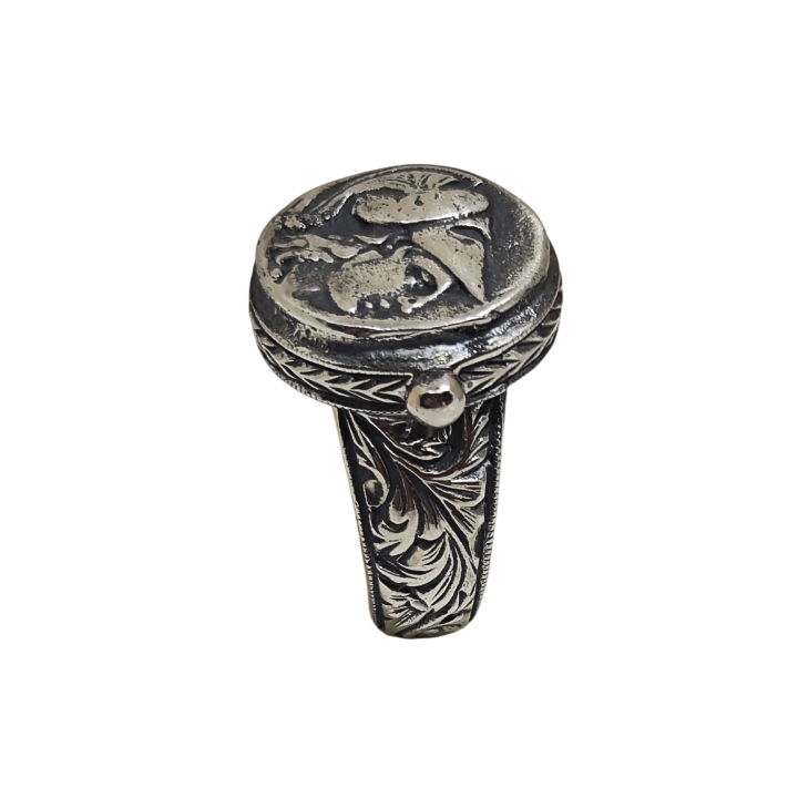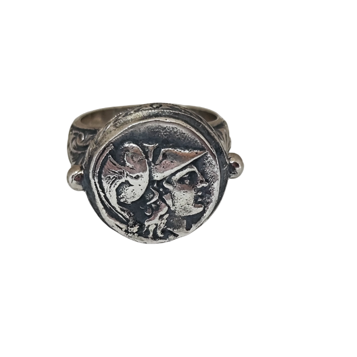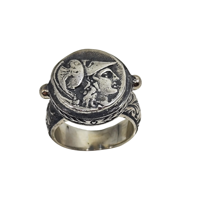Yüzüğün tepe kısmındaki antik sikke formu, Akdeniz medeniyetlerinin sembolik mirasını taşır. Antik dünyanın güçlü ve yalın estetik dili, kabartma formuyla yüzüğün merkezinde yer alır.