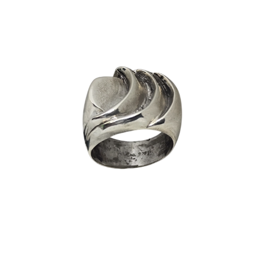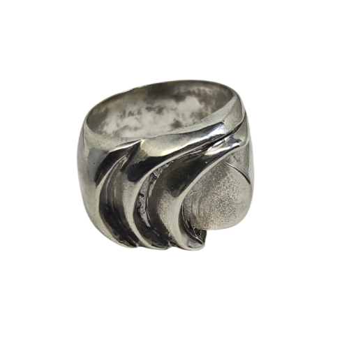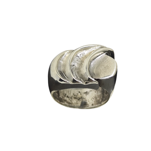 Brutalist hamlığın zarif yorumu: Kat kat kıvrılan metal formu, mat ve parlak yüzey kontrastıyla estetize edilmiş bir brutalist şahesere dönüşüyor. Sert dokuyu yumuşak akışkanlıkla dengeleyen bu tasarım, güç ve inceliğin mükemmel uyumunu parmağınızda taşıyor. Unisex yapısıyla cesur stil arayanlara sofistike bir alternatif sunar.