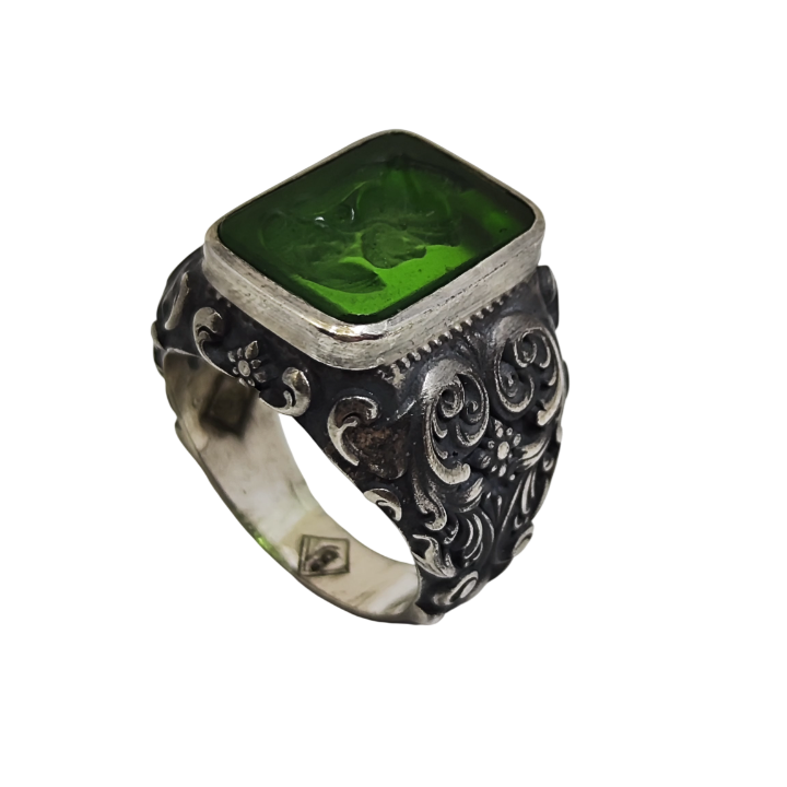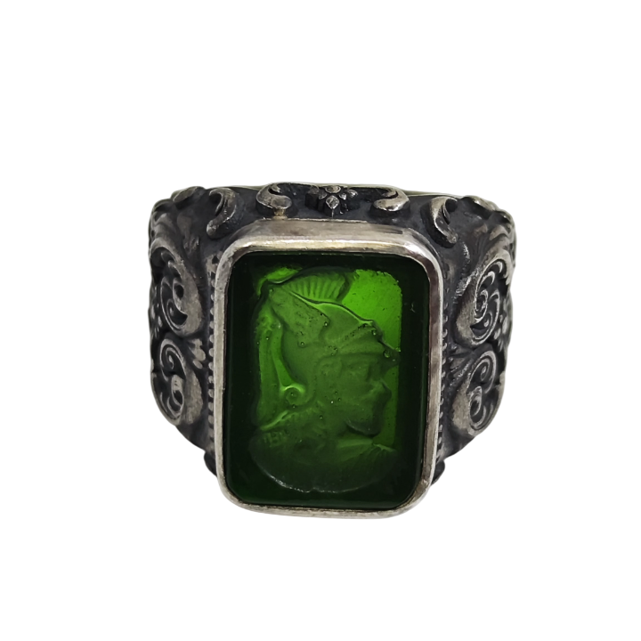 Yeşil cam üzerine oyulmuş Roma askeri, yüzüğün merkezinde antik bir mühür gibi durur.