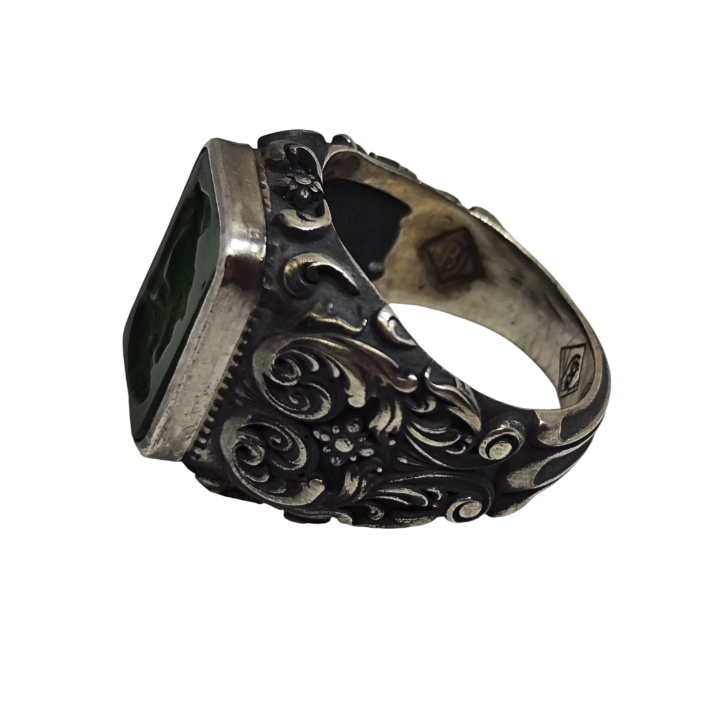 The Brothers Jewellery atölyesinde hazırlanan bu yüzük, klasik antik sembolizmi zarif dekoratif sanat anlayışıyla bir araya getiren güçlü bir tasarımdır. Yüzüğün merkezinde yer alan taş, yeşil cam üzerine oyulmuş Roma askeri intaglio figürüdür. Antik Roma döneminde mühür yüzüklerinde sıkça kullanılan bu teknik, taşın içine oyularak yapılan detaylı bir gravür sanatıdır.
