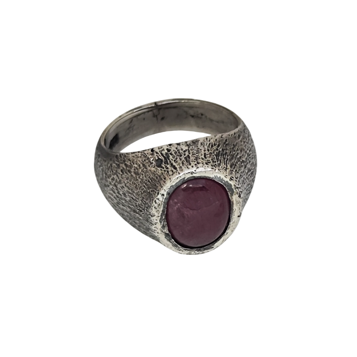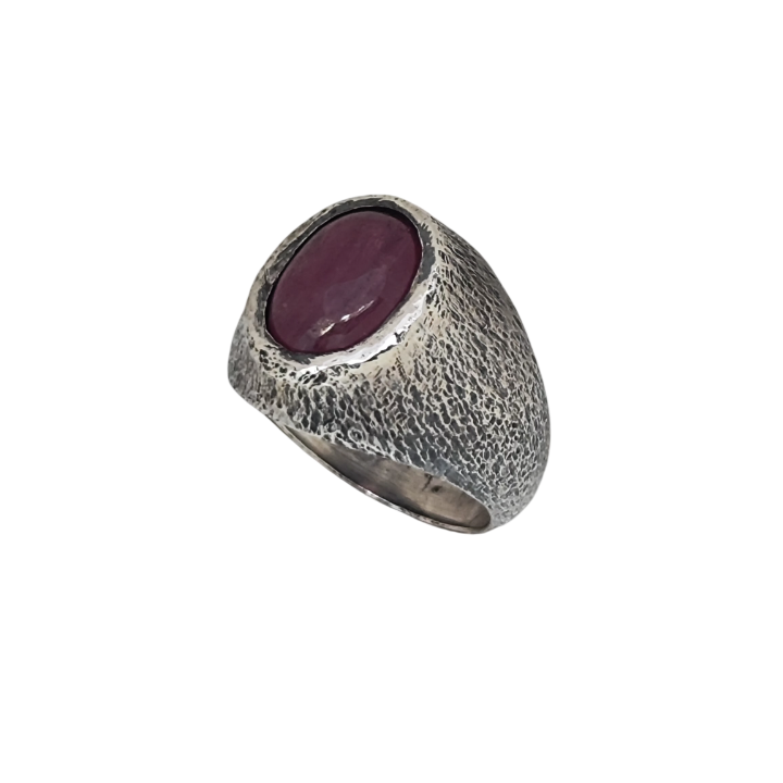 Merkezde yer alan ruby light taş, yumuşak kırmızı tonlarıyla bu sert ve dokulu formun içinde dengeli bir kontrast yaratır. Parlak taş yüzeyi ile oksitli, pürüzlü metal arasındaki ilişki, tasarımın temel estetik gücünü oluşturur.