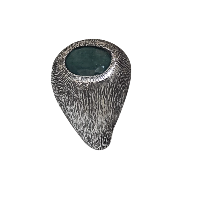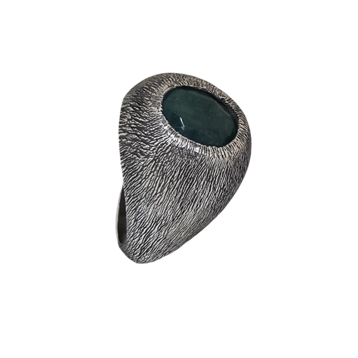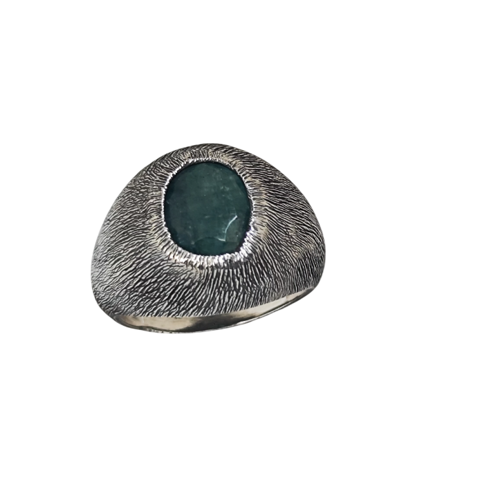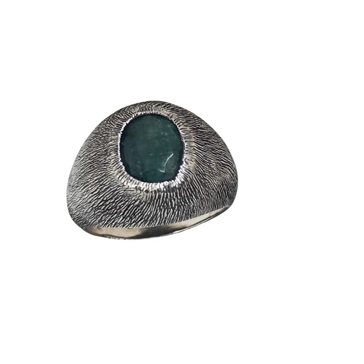 Merkezde yer alan doğal zümrüt taşı, yüzüğün içine gömülü formuyla adeta saklı bir güç gibi varlığını hissettirir. Parlak taş ile oksitli ve dokulu gümüş yüzey arasındaki kontrast, tasarımın derinliğini artırır.