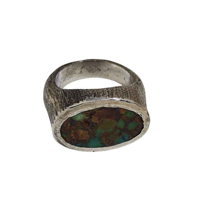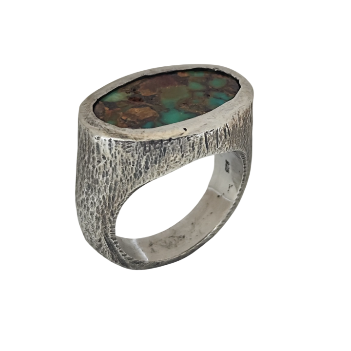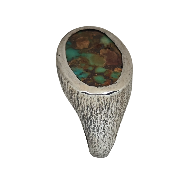 Merkezde yer alan turkuaz taş, yeşil ve toprak tonlarının iç içe geçtiği doğal yapısıyla adeta bir arazi kesiti gibi görünür. Her damar, her renk geçişi taşın benzersizliğini ortaya koyar.