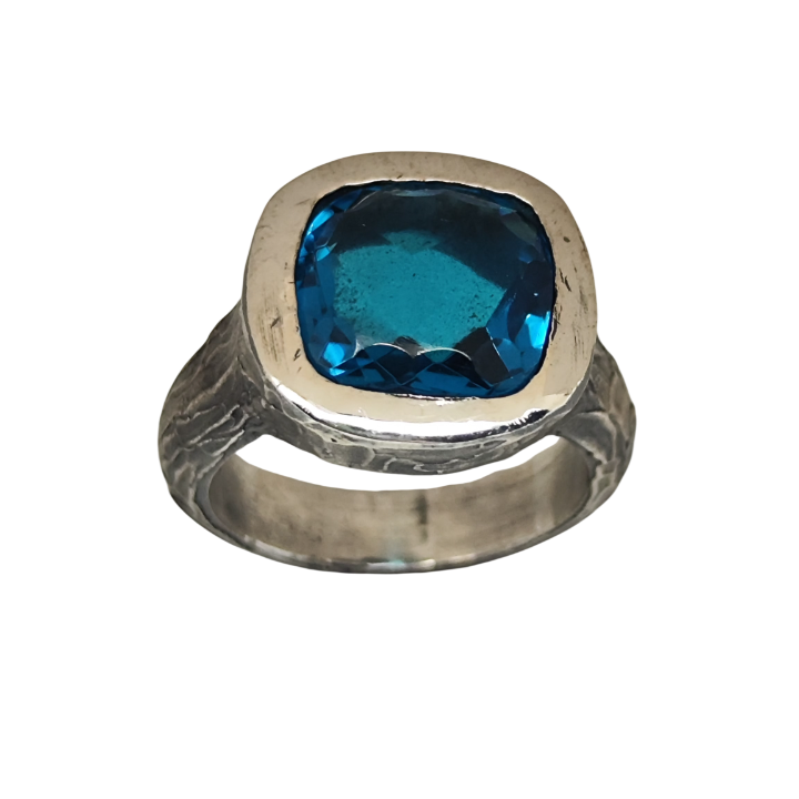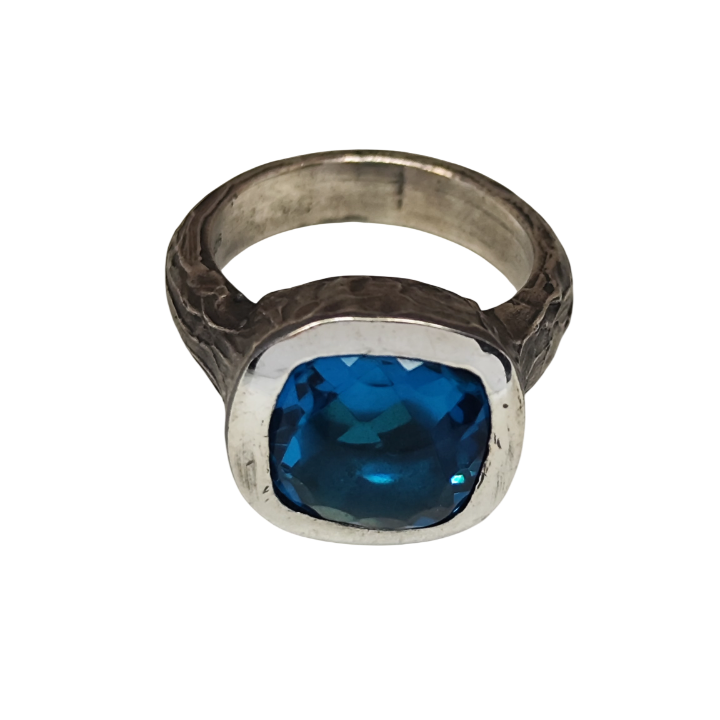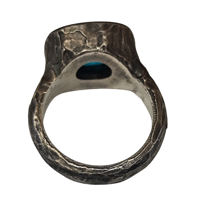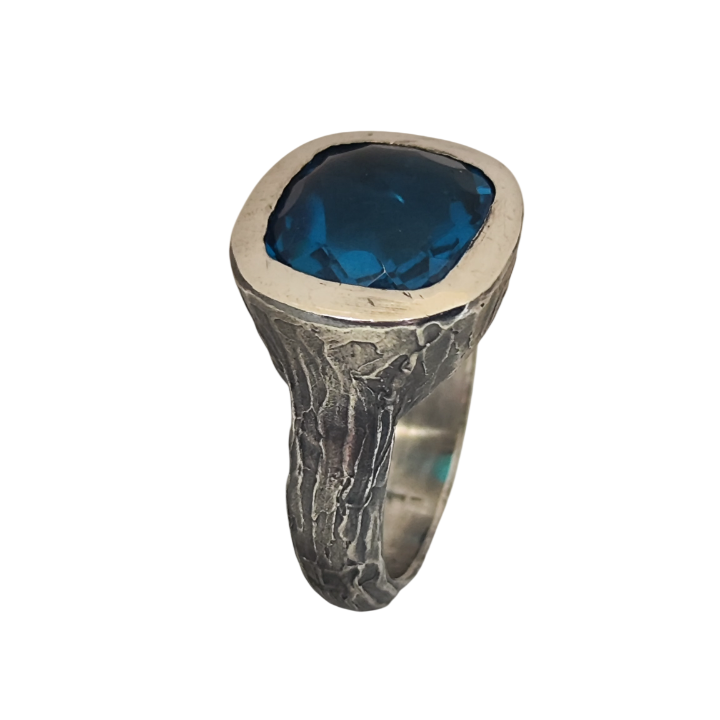 El Yapımı Nordik Stil Gümüş Yüzük – London Blue Topaz Görünümlü Taş / Oksit Dokulu / Tek Üretim