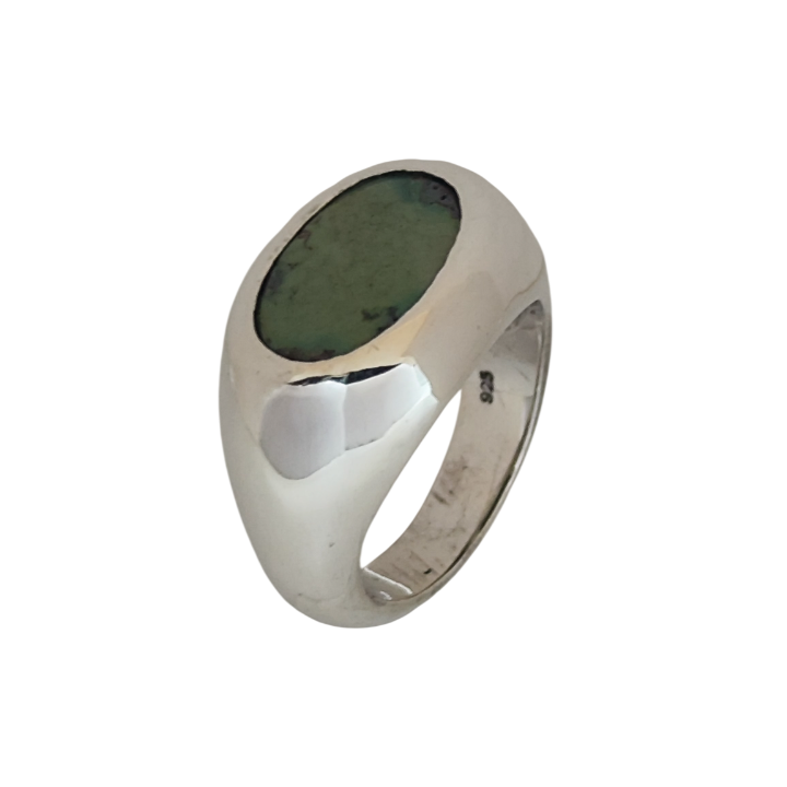 Merkezde yer alan yeşil tonlu turkuaz taş, doğal damarları ve yüzey geçişleriyle her açıdan farklı bir karakter sunar. Taşın yatay konumlandırılması, yüzüğe alışılmışın dışında bir duruş kazandırır ve elde daha geniş bir etki alanı oluşturur.