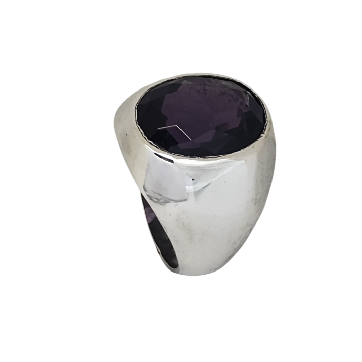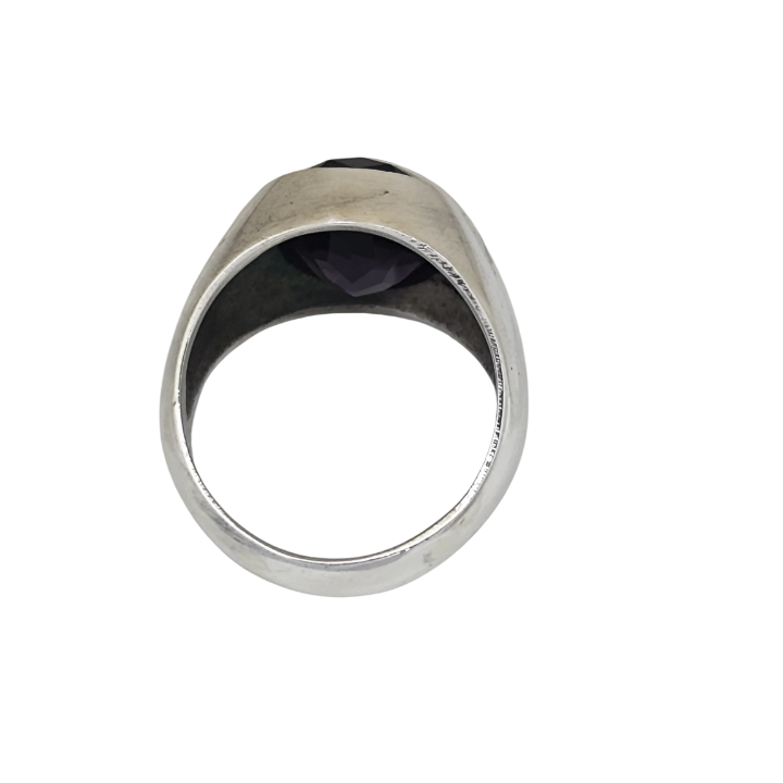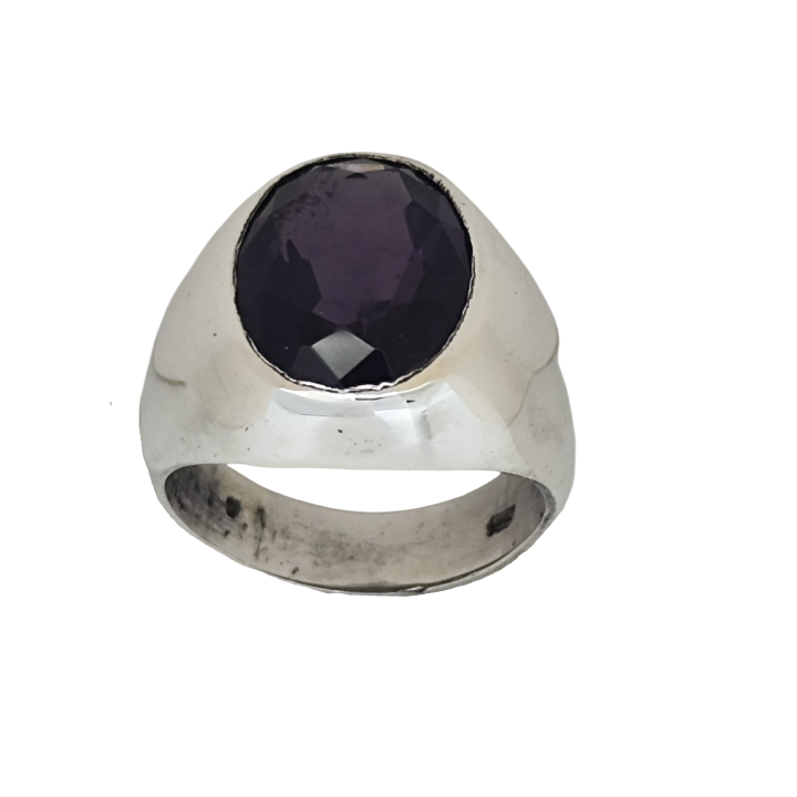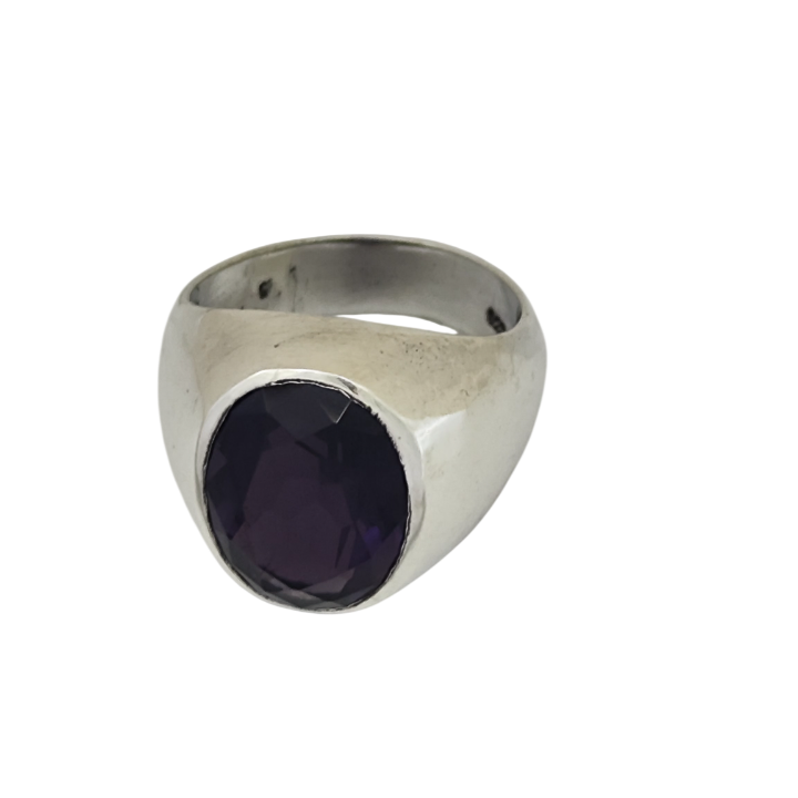 Merkezde yer alan ametist taş, morun derin tonlarıyla dikkat çeker. Işığa göre değişen yansımaları, taşın içinde sakin ama etkileyici bir hareket hissi oluşturur. Fasetli kesimi sayesinde ışığı güçlü şekilde kırar ve yüzüğe canlılık katar.