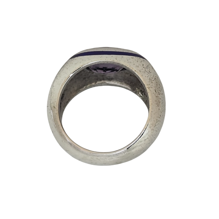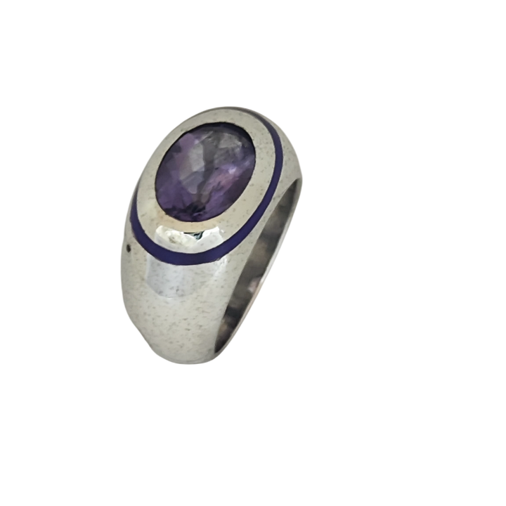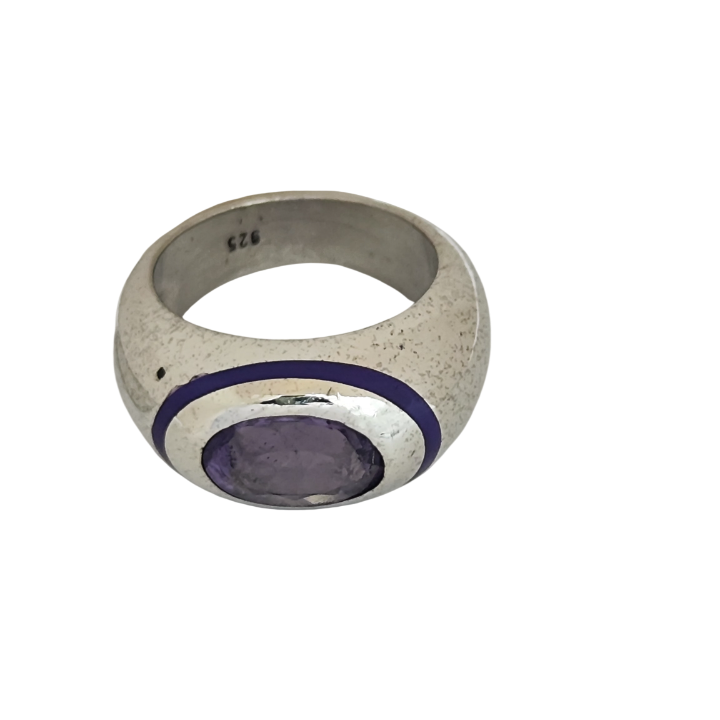 Merkezde yer alan doğal ametist taşı, derin mor tonlarıyla ışığı sofistike bir şekilde yansıtırken; çevresini saran mor mine detayı tasarıma bütünlük ve özgünlük kazandırır. Geniş ve dengeli formu sayesinde özellikle serçe parmakta güçlü, karakteristik bir duruş sergiler.