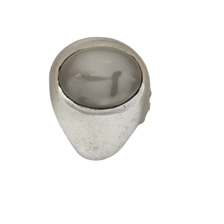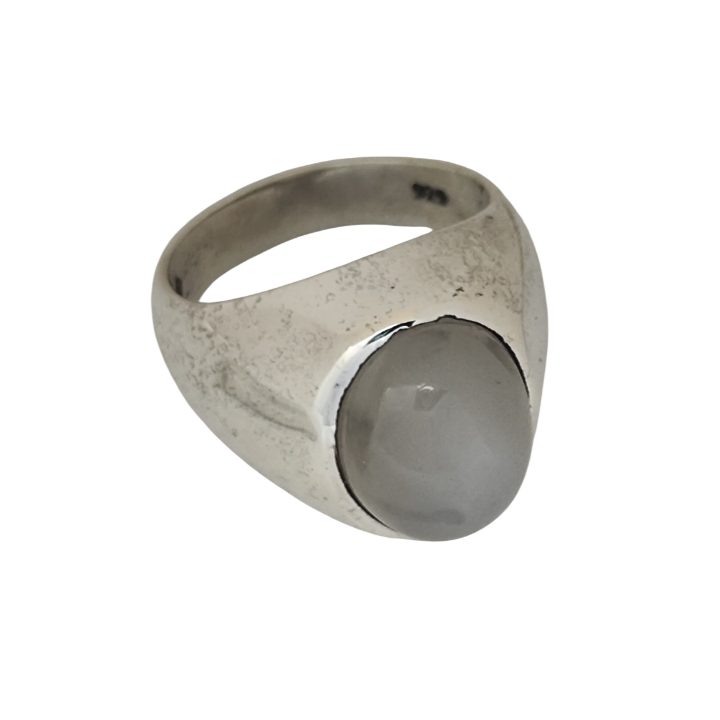 Merkezde yer alan doğal ay taşı, oval kabaşon kesimi sayesinde ışığı yüzeyinde nazikçe yayarak kendine özgü bir parlama oluşturur. Bu doğal ışıltı, yüzüğe sakin ama dikkat çekici bir karakter kazandırır.