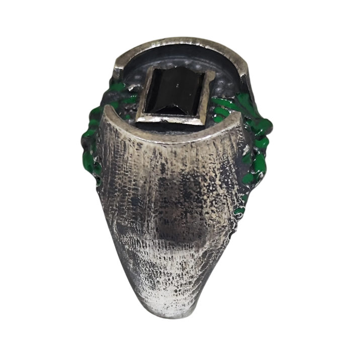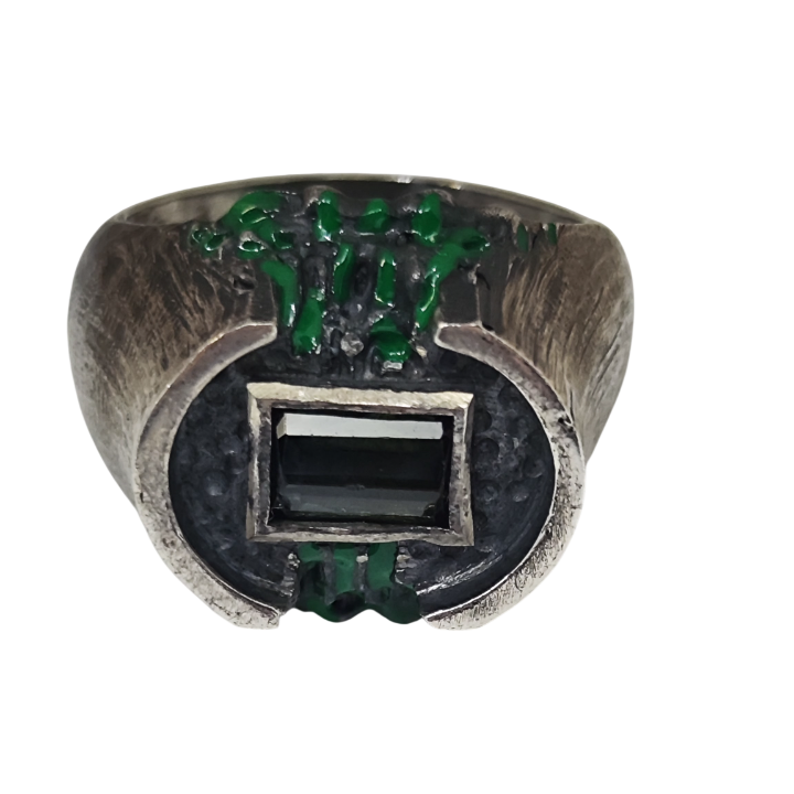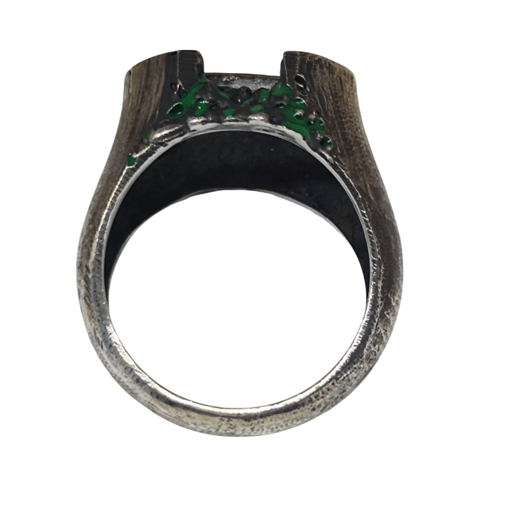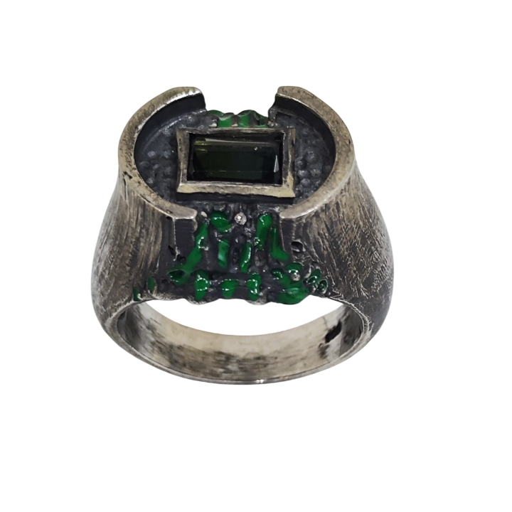 Yüzük üzerindeki yeşil akıntı formundaki detaylar, özel mine uygulamasıyla elde edilmiştir. Bu detaylar; radyoaktif sızıntıyı, kontrolsüz yayılımı ve doğaya geri dönüşü olmayan zararları temsil eder. Bilinçli olarak pürüzlü ve sert bırakılan yüzeyler, estetikten çok bir hikâye anlatır: insanın kendi yarattığı güç karşısındaki kırılganlığını.