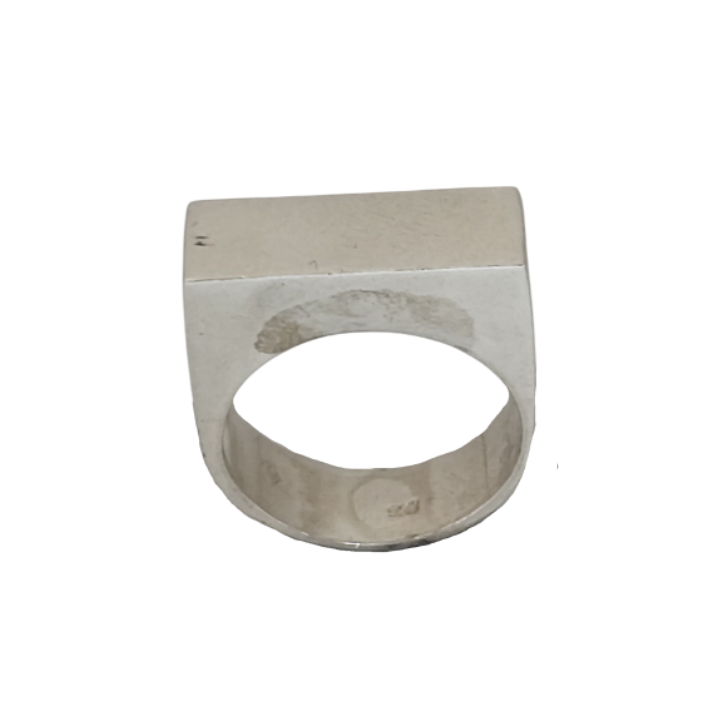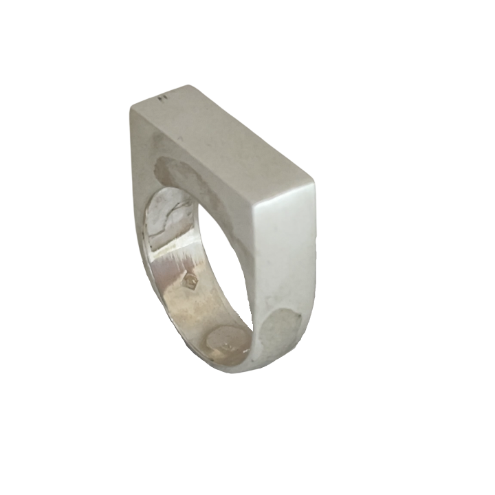 Keskin hatlar ve düz yüzeyler ışığı sakin biçimde kırarken, kompakt siluet elde heykelsi bir duruş yaratır. Geleneksel signet formunun sadeleştirilmiş, daha çağdaş ve daha brutalist yorumu…