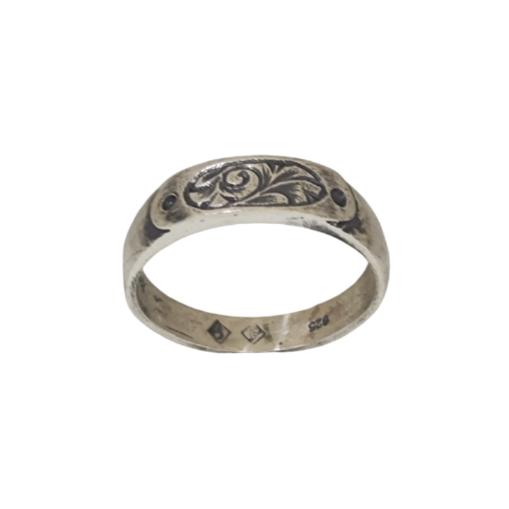 Küçük plaka detayı, yüzüğe zarif bir odak noktası kazandırırken akıcı bant formu günlük kullanım için konforlu ve dengeli bir duruş sunar. Geleneksel gravür dili, modern sadelik içinde yeniden yorumlanmıştır.