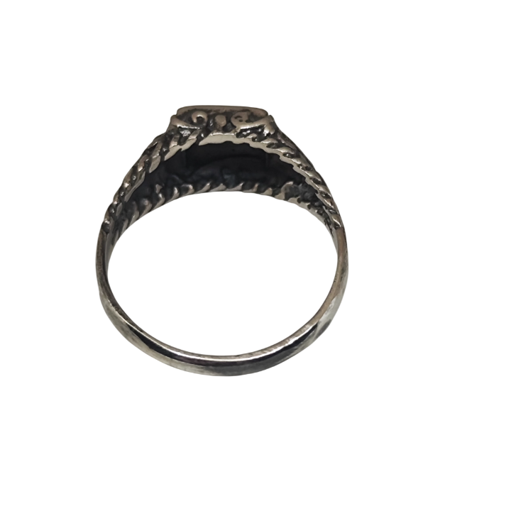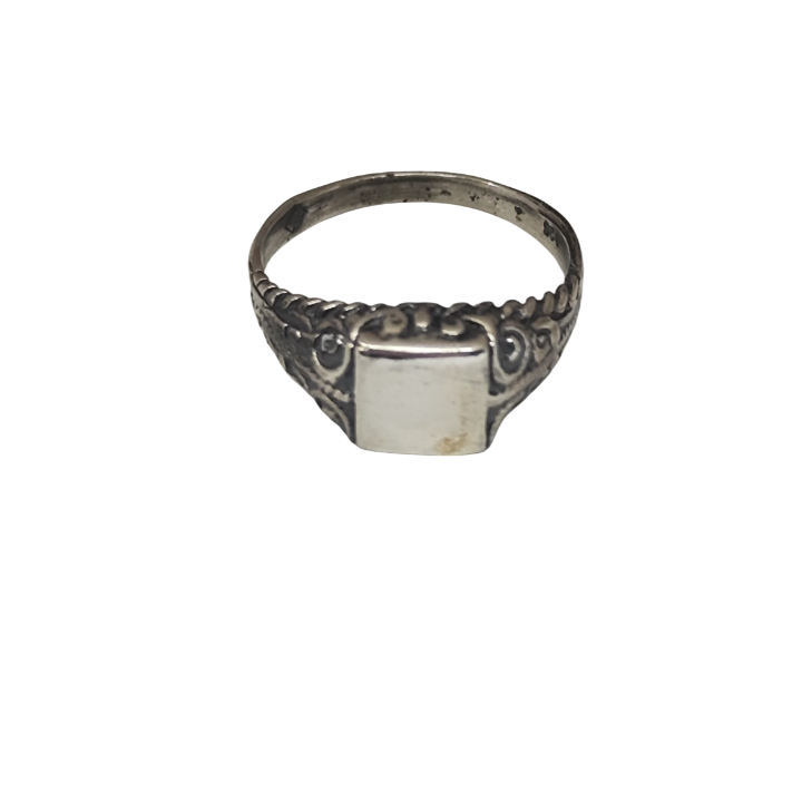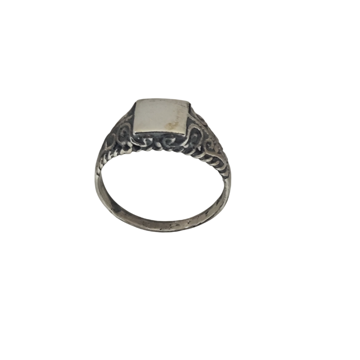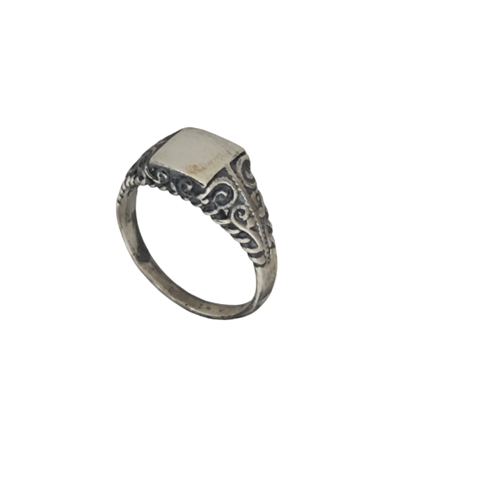 Küçük ölçekli klasik signet formunun zarif bir yorumudur. Kare tabla, yüzüğe sade bir odak verirken yanlardaki akışkan motifler geleneksel oyma karakterini taşıyor.