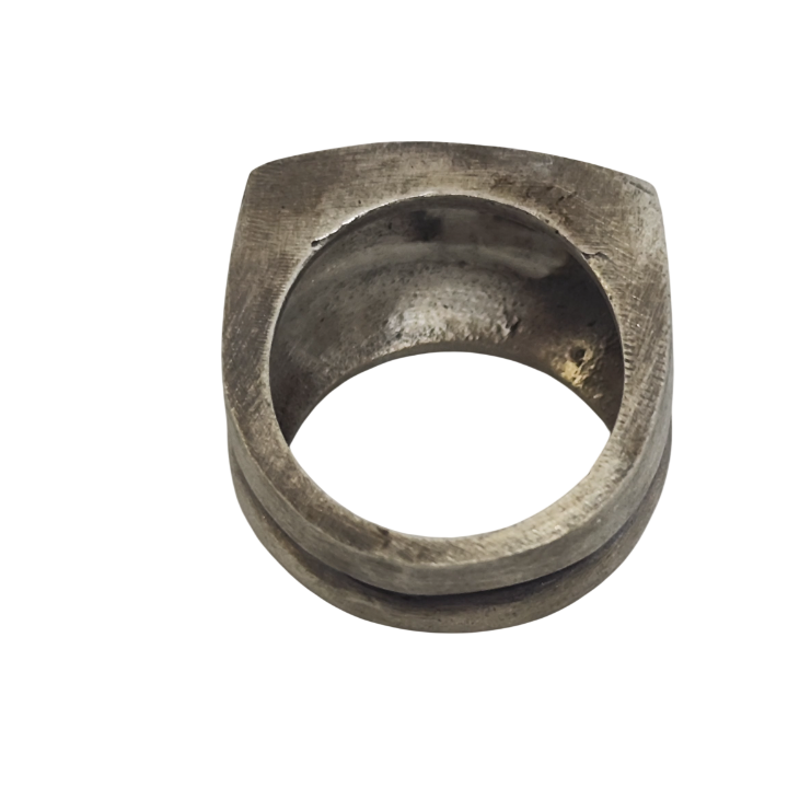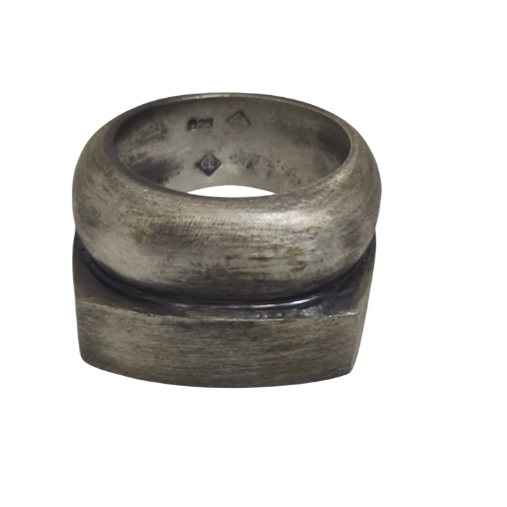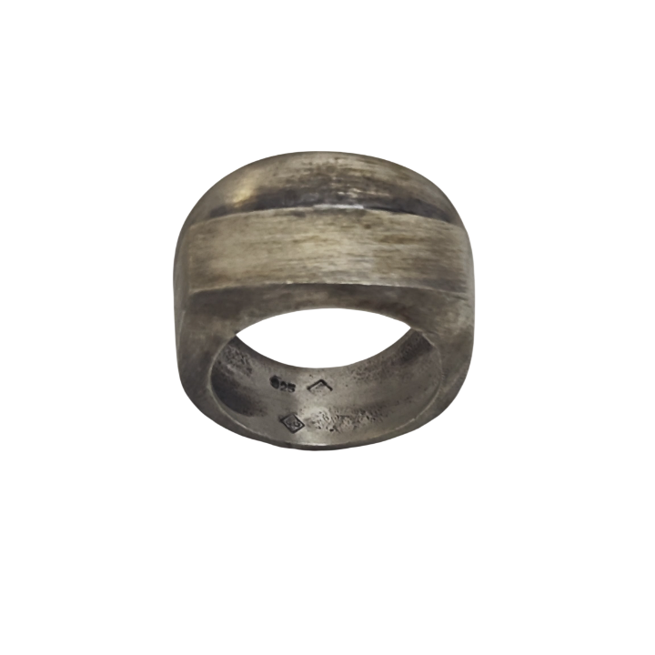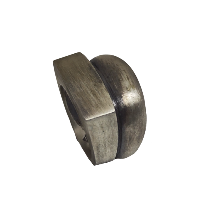 Ortadaki koyu tonlu bant, formu iki katmanlı bir yapı gibi gösterir ve yüzüğe mimari bir etki verir. Parlak versiyona kıyasla daha mat, daha endüstriyel ve daha ham bir karakter sunar. Işığı yansıtmak yerine emer; bu da modele daha tok ve ciddi bir ifade kazandırır.