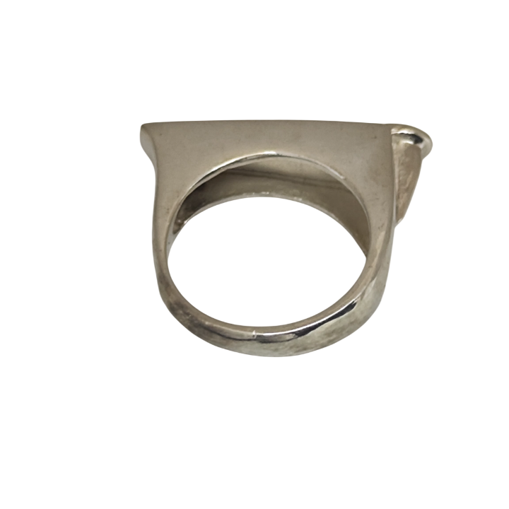 Gümüş gövde yukarı doğru genişler ve üst bölümde yatay bir hat olarak uzar. Bu çizgi, mimari bir çıkma gibi tek bir noktadan taşınıyormuş hissi verir. Yan bölümdeki metal detay ise tasarıma teknik ve fütüristik bir karakter kazandırır.