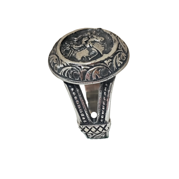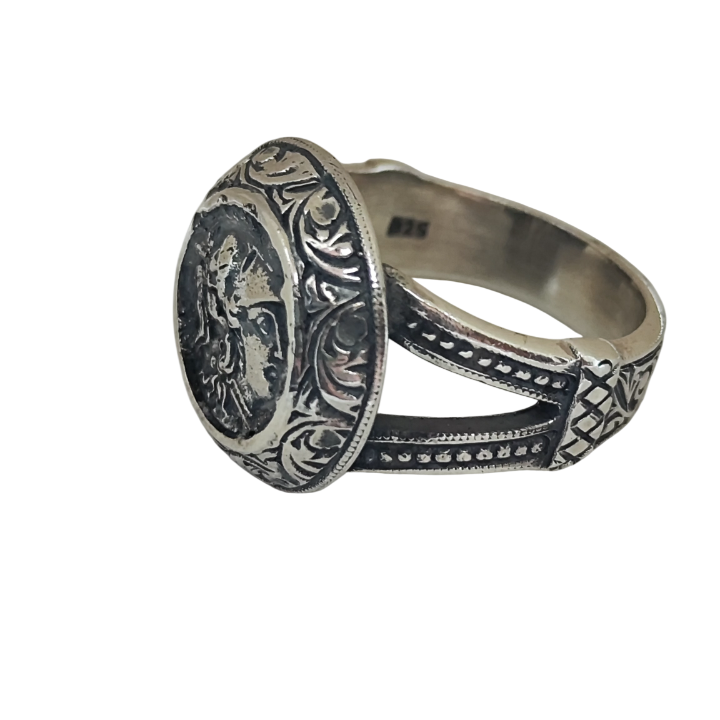 Yüzüğün tepe kısmında yer alan antik sikke formu, Akdeniz dünyasının kadim sembolik dilini temsil eder. Kabartma yüzey, antik metal estetiğini çağrıştıran güçlü ve arkaik bir karakter taşır.