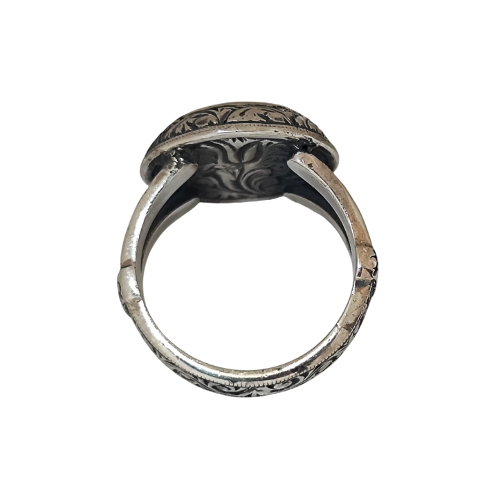 Bu merkezi formu çevreleyen rumî tarzı el kalemi gravürler, Anadolu ve İslam sanatının akışkan çizgilerini tasarıma dahil eder. Sonsuzluğu ve sürekliliği simgeleyen bu motifler, antik dünyanın sikke estetiğiyle birleşerek farklı sanat geleneklerini aynı yüzükte buluşturur.