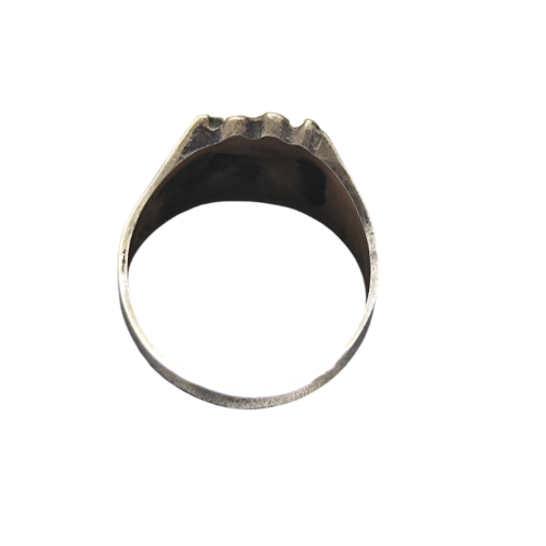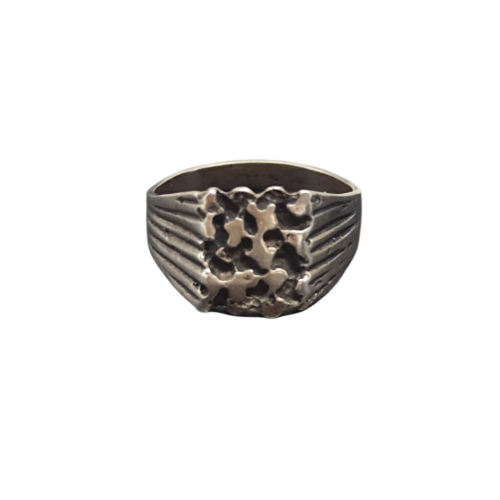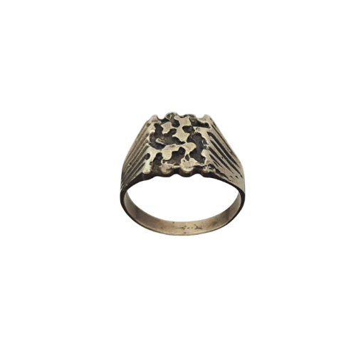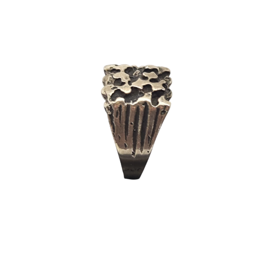 Brutalist estetikten ilham alan bu cesur yüzük, yüzeyindeki derin çukurlar, düzensiz kabartmalar ve engebeli dokusuyla endüstriyel bir güç hissi uyandırıyor. Adeta meteor çarpmış bir metal parçası ya da uzun yıllar erozyona uğramış bir kaya yüzeyi gibi tasarlandı. Her parçası tamamen el yapımı olduğundan, hiçbir yüzük diğerinin tıpatıp aynısı değil – size özel, eşsiz bir parça.