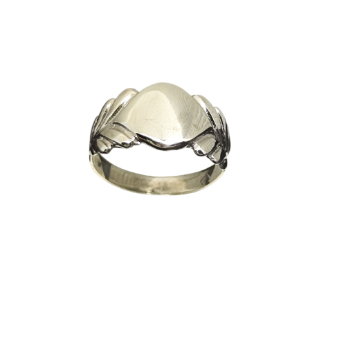 Ortadaki yumuşak hatlı yüzey, yüzüğe sakin ve dengeli bir karakter kazandırırken; yanlarda yükselen detaylar adeta formu koruyan bir yapı oluşturur.