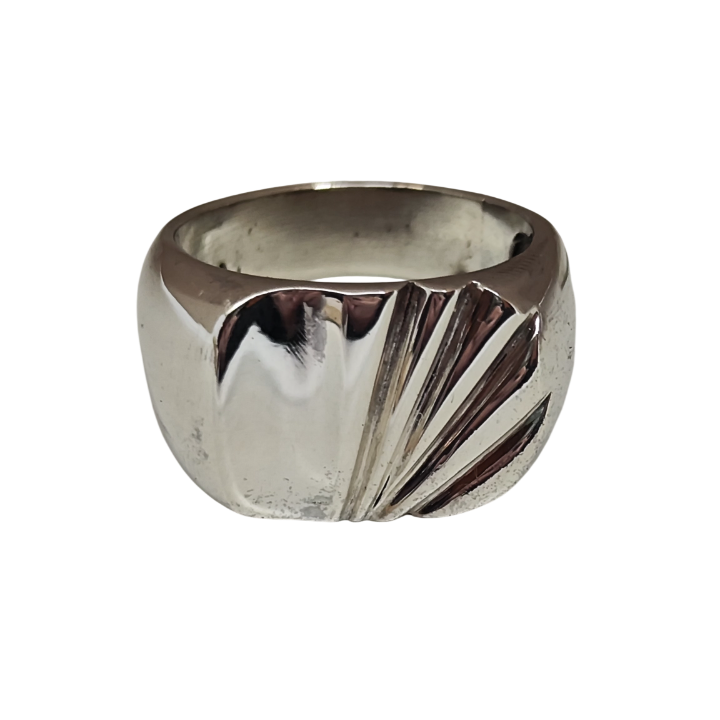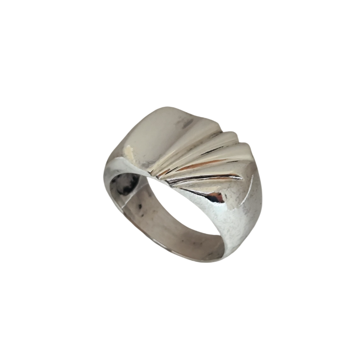 Gümüş Yelpaze, merkezden dışa doğru açılan yelpaze formuyla hareket ve dengeyi bir araya getiren zamansız bir tasarımdır. Ön yüzdeki ışın formundaki oyuklar, gümüş yüzeyle birlikte ışığı farklı açılardan yakalayarak sade ama etkileyici bir görünüm oluşturur.
