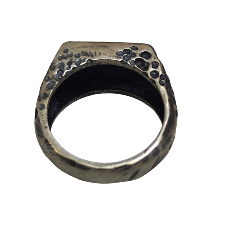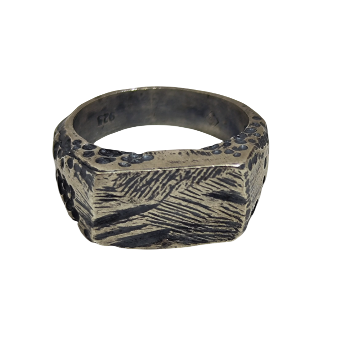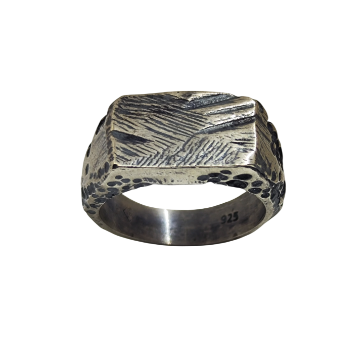 Tamamı el yapımı olarak üretilen bu parça, 925 ayar gümüşten yapılmıştır. Oksitli yüzey uygulaması, dokuları daha belirgin hale getirerek derinlikli ve zamansız bir ifade kazandırır. Seri üretim anlayışından uzak olan bu tasarımda, her yüzük kendine özgüdür.
