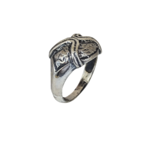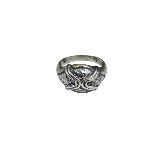 Miğferi andıran formu, korunma ve hâkimiyet fikrini doğrudan çağrıştırır. Keskin hatlar ve dengeli hacim, yüzüğe ağır ama kontrollü bir karakter kazandırır. Gösteriş içermez; dikkat çekmesi gerekmez.