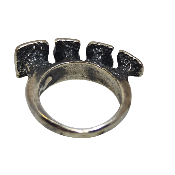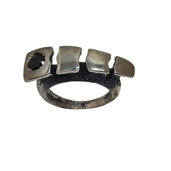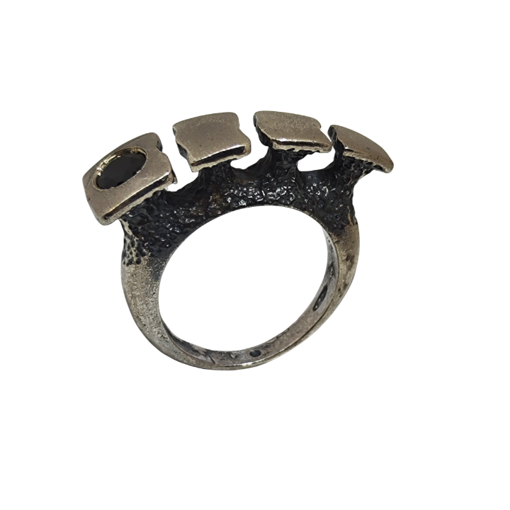 Desert Voyager, ilk bakışta alışılmış formların dışına çıkan, güçlü ve deneysel bir tasarıma sahip özgün bir yüzüktür. Üst bölümde yan yana dizilen yükseltilmiş plakalar ve uç kısımdaki koyu taş detayı, çölde ilerleyen bir uzay aracını andıran sıra dışı bir siluet oluşturur. Organik dokulu gövde ile geometrik üst formun birleşimi, yüzüğe hem ilkel hem de futuristik bir karakter kazandırır.