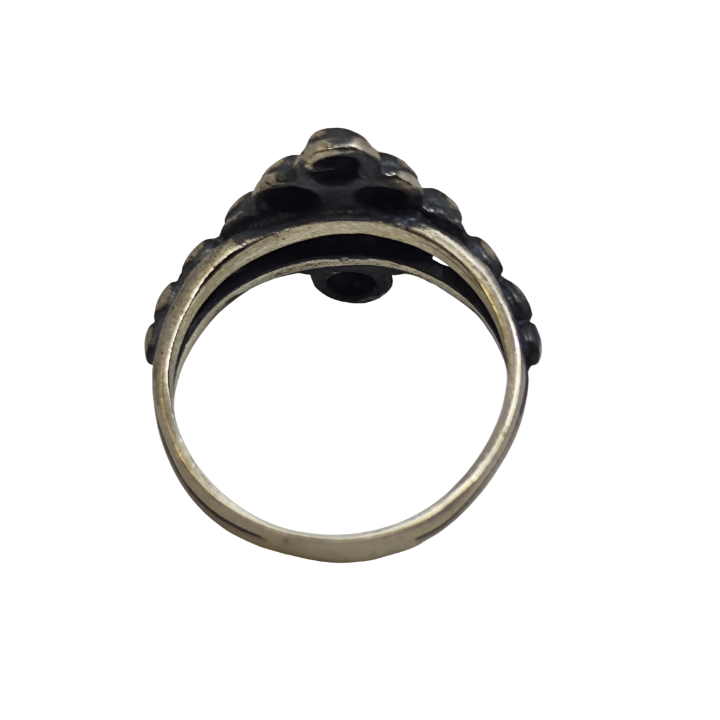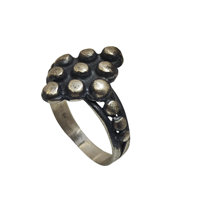 Tribal Dots Ring, ilkel formlardan ve etnik süsleme geleneğinden ilham alan güçlü bir tasarımdır. Üst bölümde üçgen bir düzen içinde yerleştirilen kabartmalı noktalar, eski kabile takılarını hatırlatan ritmik ve dengeli bir kompozisyon oluşturur. Bu tekrar eden form, yüzüğe hem sembolik hem de karakterli bir duruş kazandırır.