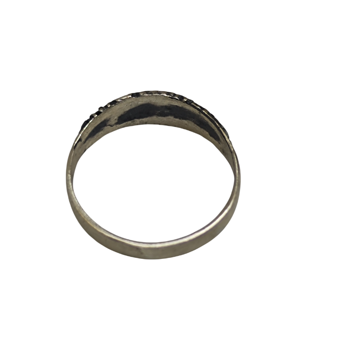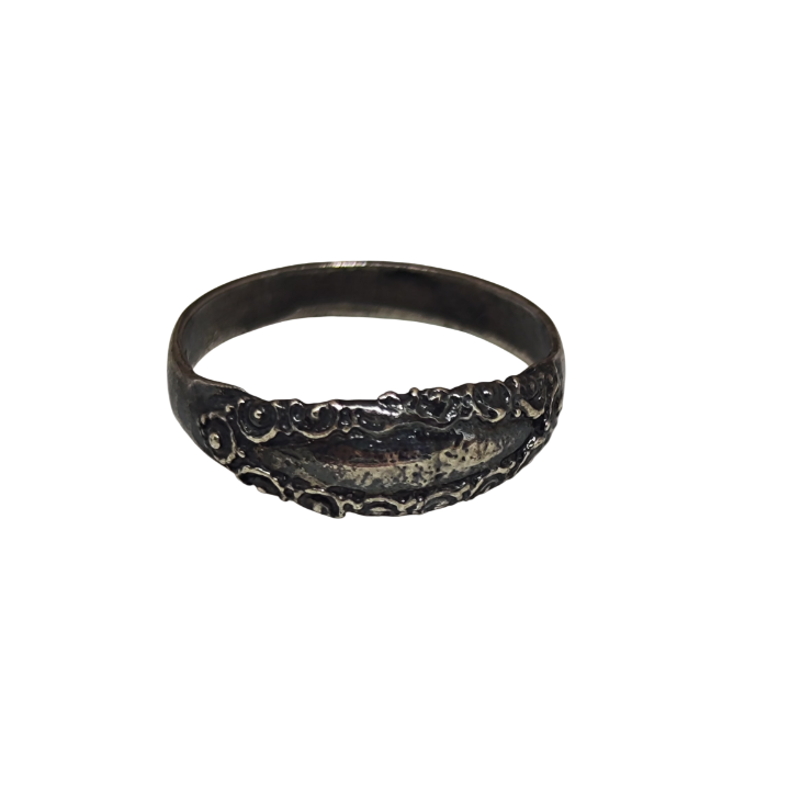 Eskitilmiş yüzey dokusu, detayların daha belirgin görünmesini sağlarken, yüzüğün geçmişten gelen bir hikâyesi varmış hissi uyandırır. İnce ve rahat formu sayesinde günlük kullanım için uygundur; tek başına sade bir şıklık sunabileceği gibi diğer yüzüklerle birlikte kombinlendiğinde de güçlü bir stil tamamlayıcısı olur.