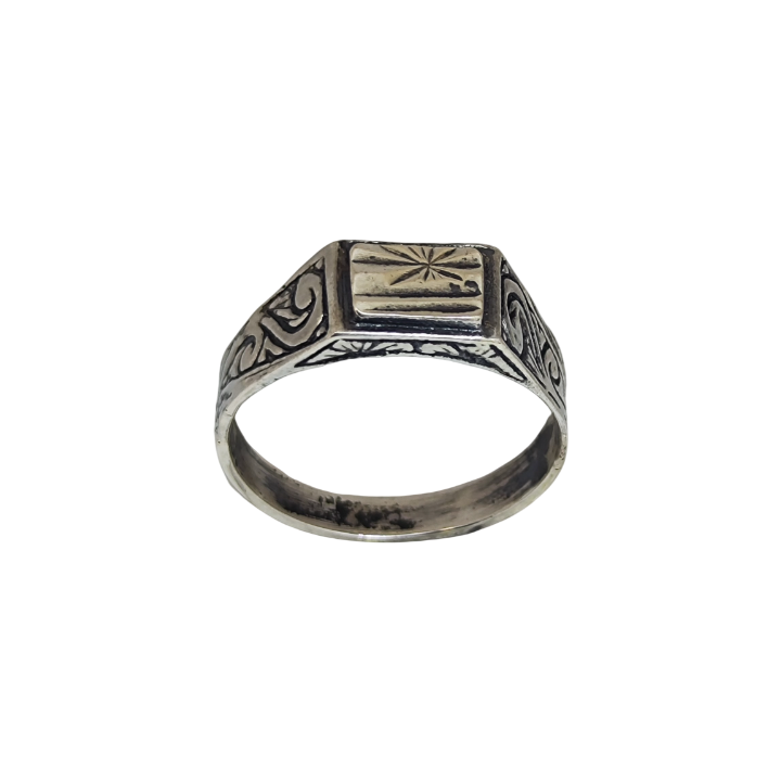 Klasik mühür yüzük formunun sade ve zarif bir yorumudur. Üst bölümde yer alan yıldız benzeri motif, ışığın merkezden dışa yayılışını andıran dengeli bir kompozisyon sunar. Yan yüzeylerdeki ince işleme detayları ise tasarıma geleneksel bir karakter ve derinlik kazandırır.
