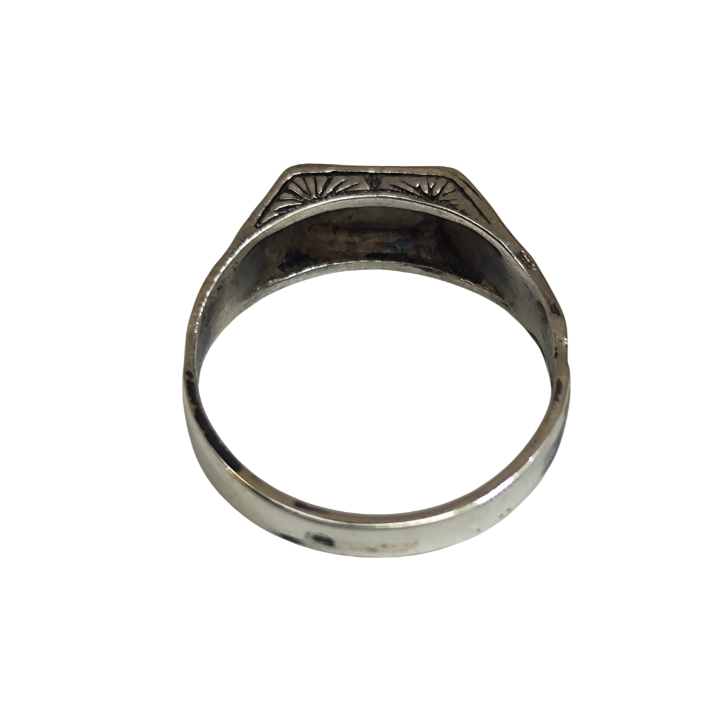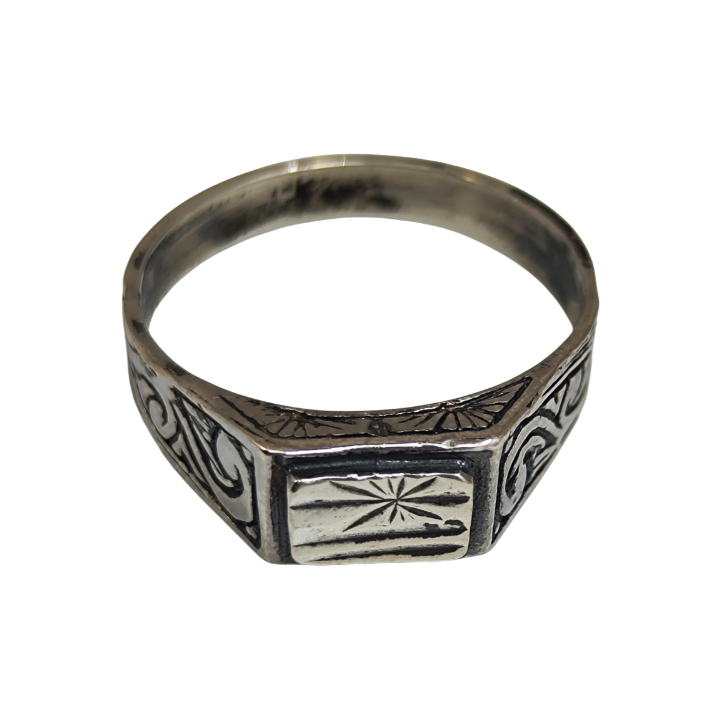 Parlatılmış gümüş yüzey ile oksitli dokuların birlikteliği, motiflerin daha belirgin görünmesini sağlar ve yüzüğe hafif bir vintage hissi katar. Ne fazla ağır ne de fazla sade olan bu model, günlük kullanımda rahatlıkla tercih edilebilecek dengeli bir tasarıma sahiptir.