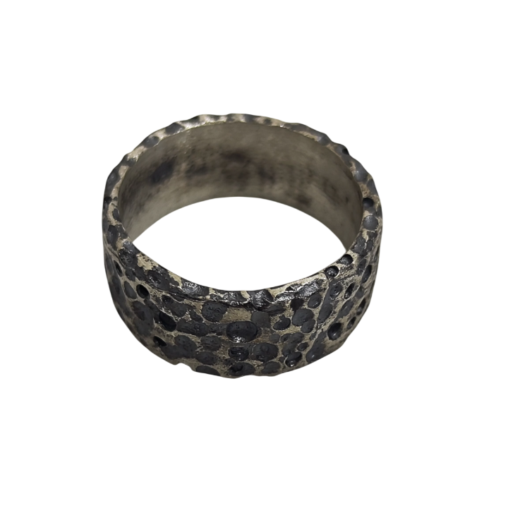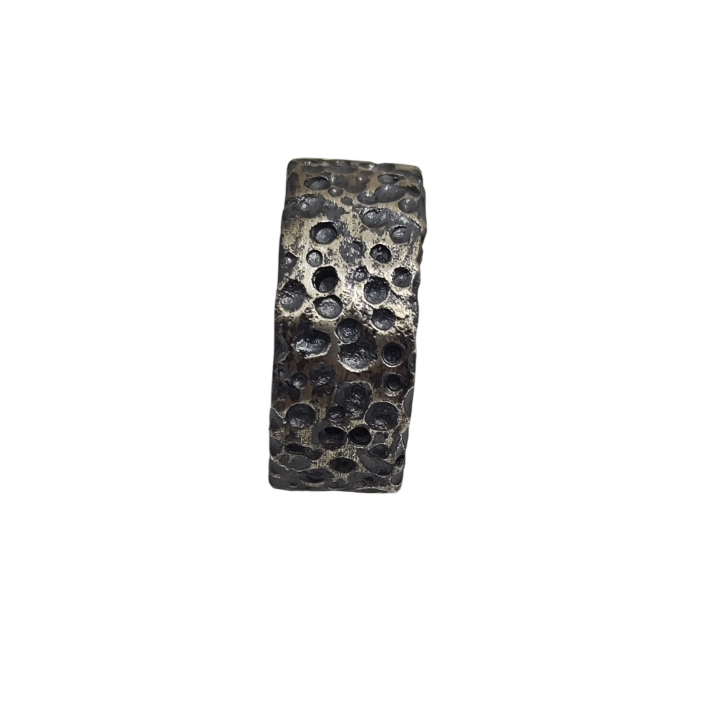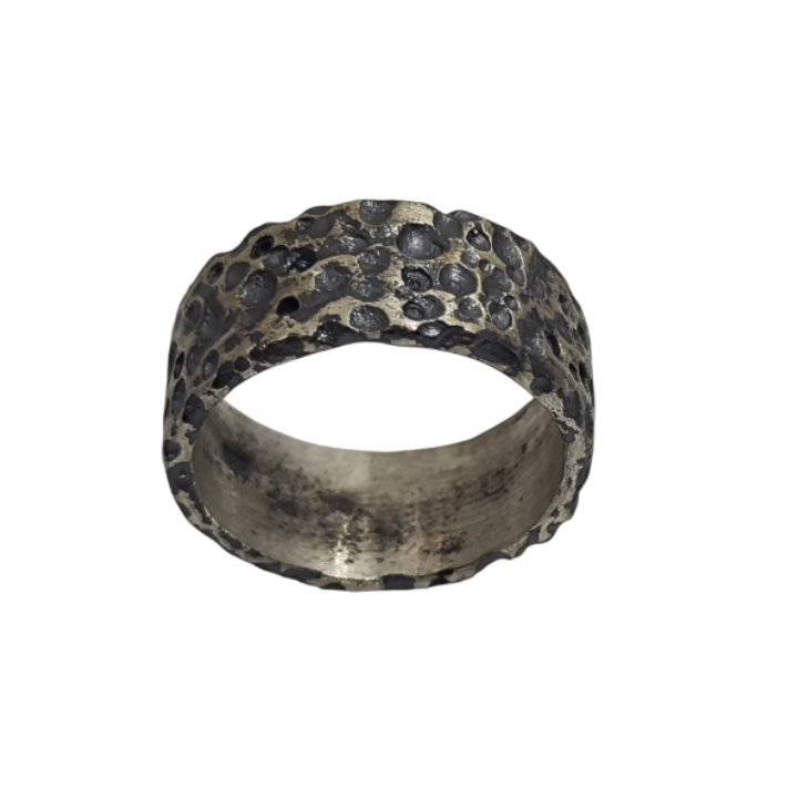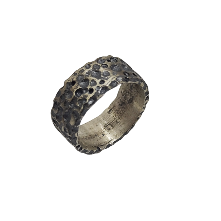 Yüzeyinde yer alan organik çukur dokularıyla zamanın ve doğanın izlerini taşıyan güçlü bir form sunar. Elde oluşturulan düzensiz yüzey yapısı, ham metal estetiğini ön plana çıkarırken uygulanan patina derinlik ve karakter kazandırır. Minimal formuna rağmen güçlü bir ifade taşıyan bu tasarım, dokusal zenginliğiyle öne çıkan modern bir artisan yüzük anlayışını yansıtır. The Brothers Jewellery’nin Kapalıçarşı’daki aile atölyesinde el işçiliğiyle üretilen her parça, yüzey dokusundaki doğal farklılıklar sayesinde kendine özgü bir karakter taşır.