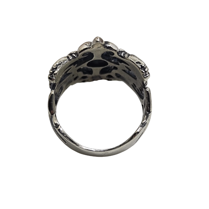 Mitolojik yaratık estetiğini barok ornamentlerle birleştiren güçlü ve detaylı bir statement tasarımdır. Akışkan hatlar, simetrik motifler ve merkezdeki yükseltilmiş form yüzüğe mask benzeri karakter kazandırırken uygulanan oksit ve patina, detayların derinliğini vurgulayarak dramatik bir görünüm oluşturur. Heykelsi yapısı sayesinde özellikle baş parmak yüzüğü olarak güçlü bir duruş sunar; ancak tasarım formu gereği işaret, orta ve yüzük parmağında da rahatlıkla kullanılabilir. The Brothers Jewellery’nin Kapalıçarşı’daki aile atölyesinde el işçiliğiyle üretilen bu parça, karakterli ve dikkat çekici bir artisan yüzük arayanlar için tasarlanmıştır