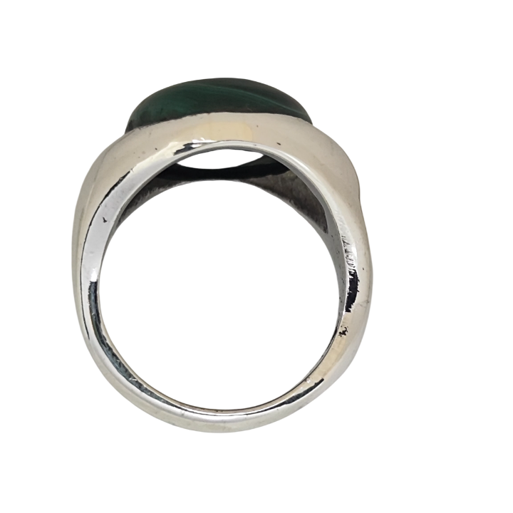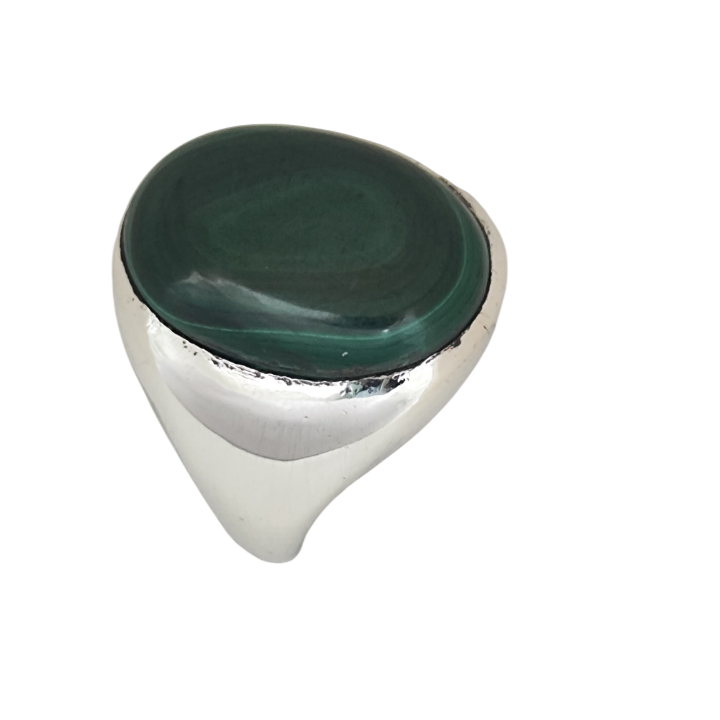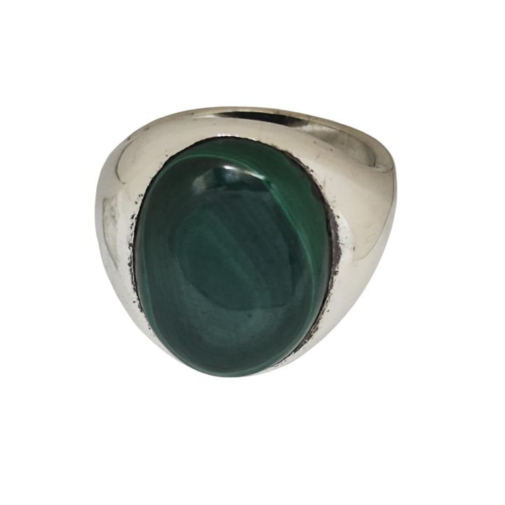 Merkezde yer alan doğal malahit taşı, kendine özgü yeşil damar yapısıyla her açıdan farklı bir derinlik sunar. Gömme mıhlama tekniğiyle yerleştirilen geniş taş, yüzüğün formuyla bütünleşerek parmağı kaplayan güçlü ve dengeli bir duruş oluşturur.